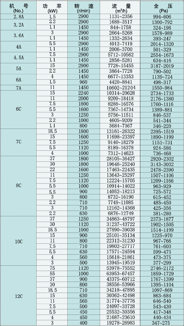 (1)葉輪:由10個后傾機翼型葉片、曲線型前盤和平板后盤組成,用鋼板制造,并經動、靜平衡校正,空氣性能良好,效率高,運轉平穩。